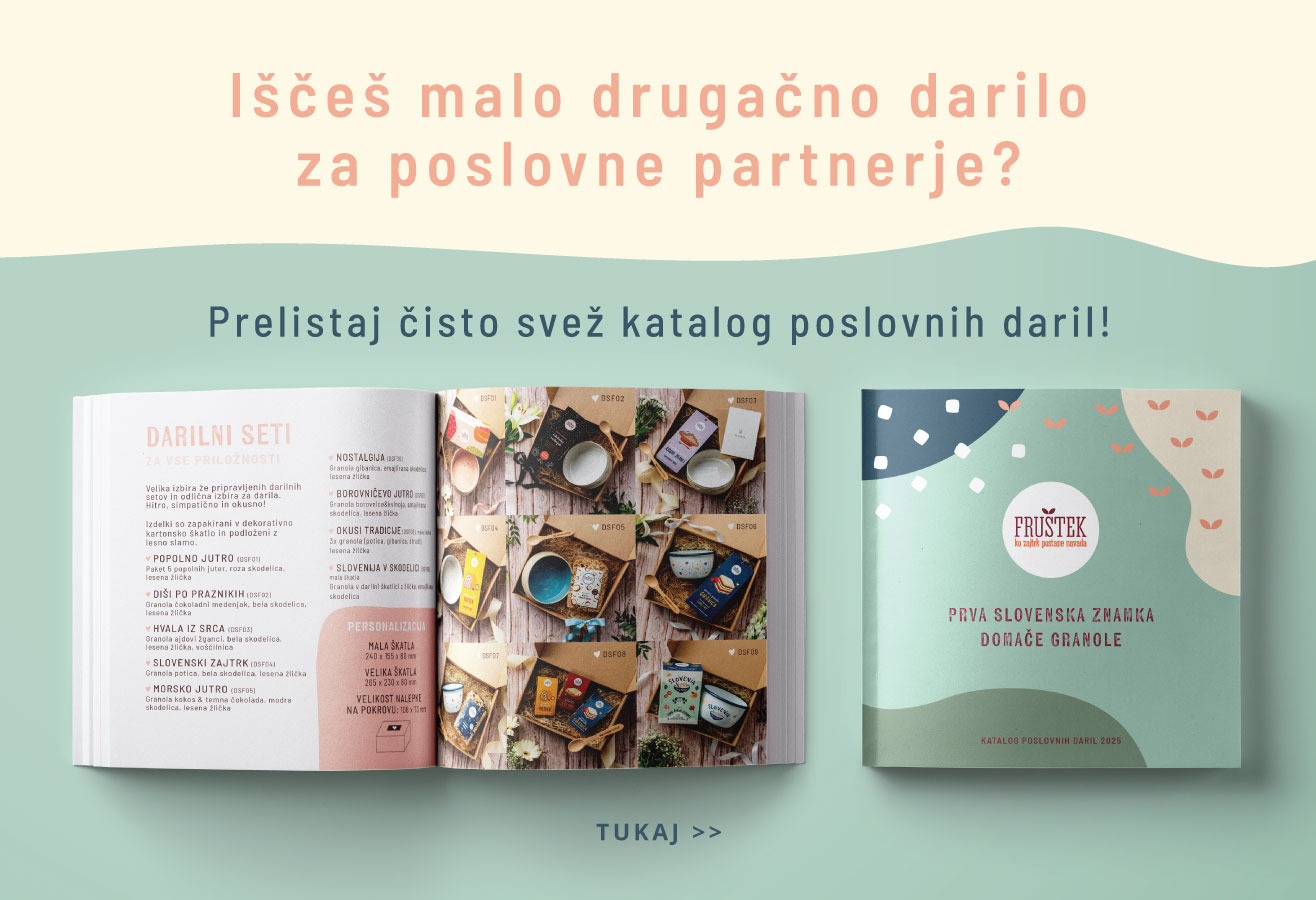 Na naši strani lahko spremljate tudi blog članke, kjer se vedno najde kaj zanimivega o domači granoli, ideje za zajtrk, namigi o zdravem prehranjevanju in zdravem načinu življenja, ter recepti, kako uporabiti granolo še na kakšen drug način. Fruštek ponujamo tudi kot poslovna darila – pa naj bo to božično obdarovanje za zaposlene ali promocijsko darilo za poslovne partnerje. Po želji lahko darilne paketke tudi personaliziramo. Za vse oblike nastanitev (hoteli, penizioni, glampingi, apartmaji, bed&breakfast,…) in gostinske obrate ponujamo tudi domačo granolo v različnih pakiranjih (mini, klasik in maksi pakiranje ali rinfuza).